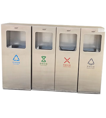 深圳新標準城中村街道社區不銹鋼五分類垃圾桶由有害垃圾、玻璃、金塑紙(為金屬、塑料、紙張的簡稱)、廚余垃圾、其他垃圾這5分類不銹鋼垃圾桶組合而成。其中金塑紙、其他垃圾日常產生量較大,所以分類收集容器也