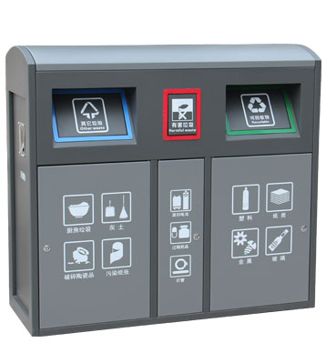 中山市政園林綠化工程定制的這款卡通風格造型的戶外垃圾桶,紅、灰、藍三色分別用于有害垃圾、其他垃圾、可回收物垃圾分類收集使用,優質鍍鋅板金屬烤漆,帶宣傳欄平臺底座絲印“垃圾不落地,環境更美麗