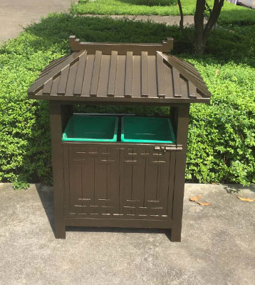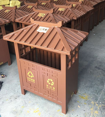 欣方圳景區仿古鋼制垃圾桶,桶頭部分屋檐造型,造型優美、古色古香。