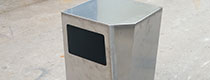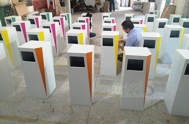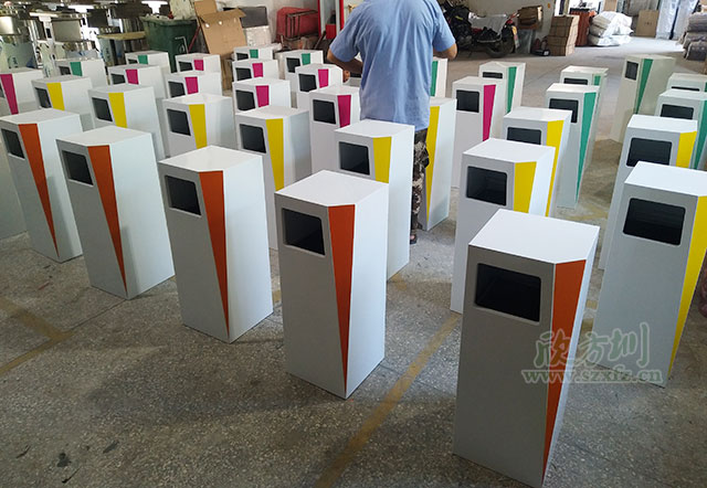 欣方圳商場室內鋼制垃圾桶經裁剪——折彎——氬弧焊焊接成型,再經酸洗磷化——靜電噴塑;確保桶體的戶外防銹能力和抗腐蝕性能;。