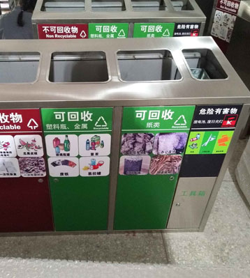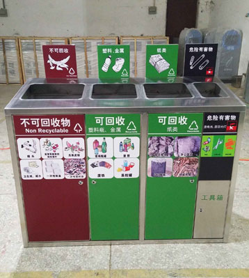 不銹鋼分類果皮箱桶身及桶頭垃圾投放標識醒目,不可回收、可回收塑料瓶金屬、可回收紙類、危險品,并帶兩層的工具箱;內桶采用優質加厚鍍鋅板制作,防銹蝕能力升級。