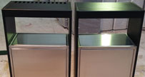 不銹鋼戶外分類果皮箱采用304#優質不銹鋼材質制作,黑色部分做不銹鋼噴塑處理其他為本色,投口搖蓋復位設計防異味擴散,底座孔位與地面固定