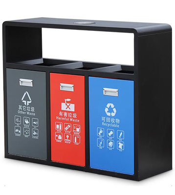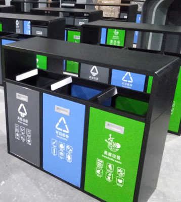 街道戶外三分類垃圾回收箱采用足厚優質冷板材質制作,做工扎實精良,表面打磨拋光無利口不傷手,產品符合生活垃圾分類要求。