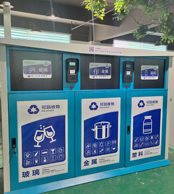 • 產品特點:社區智能分類垃圾桶回收紙張、塑料、金屬、玻璃、紡物、有害、廚余、其他等八種常見可回收再生資源。內置智能自動稱重模塊,后臺時刻檢測回收箱垃圾重量,滿溢自動停用功能并自動發送預警信息及時清運;帶感光燈控開關傍晚會自動開啟照亮功能;用戶身份識別系統,可追塑垃圾投放來源;帶管理系統積分兌換禮品。