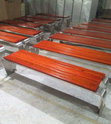 公園不銹鋼戶外休閑凳椅面原材料采用真空泵排除空氣、填充防腐液、加壓滲透、抽真空排出多余防腐液達到先進的防腐防蟲工藝。