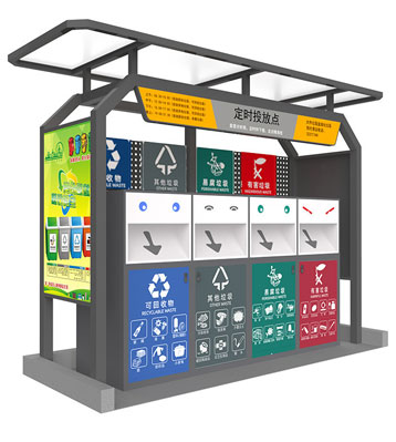 設(shè)有擋雨棚,可配備垃圾箱信息顯示屏、防水照明燈、廣告屏,進行地面硬化。對社區(qū)玻金塑紙可回收物,其他垃圾,廚余垃圾,有害垃圾等生活垃圾定時定點投放收集.