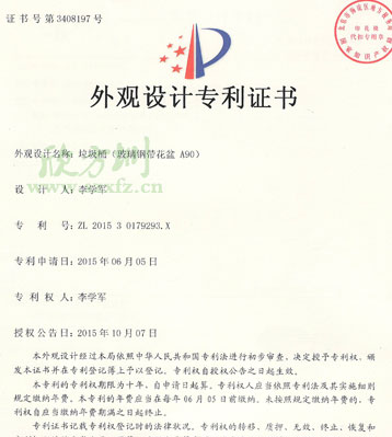 • 產品名稱:玻璃鋼花盆式垃圾桶(專利號:ZL 2015 3 0179293.X)